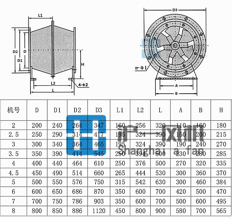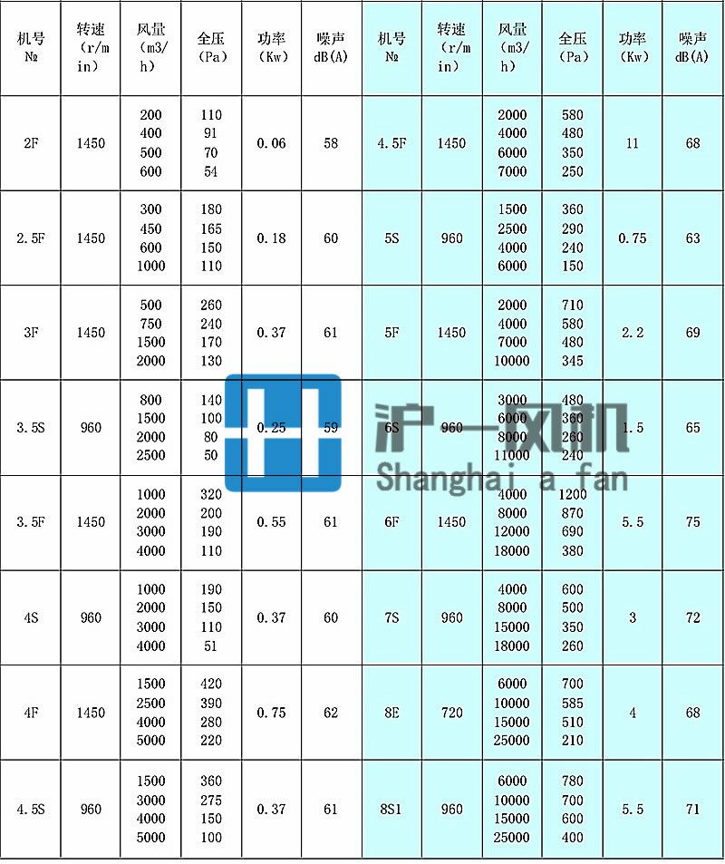 5.风按叶轮直径分为200-800mm十几种规格、十几个机号,风量由200~2500m3/h。 全压由50~1200Pa;具体工况数据请査看风机性能参数表.