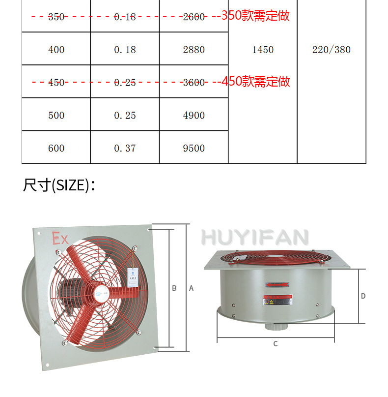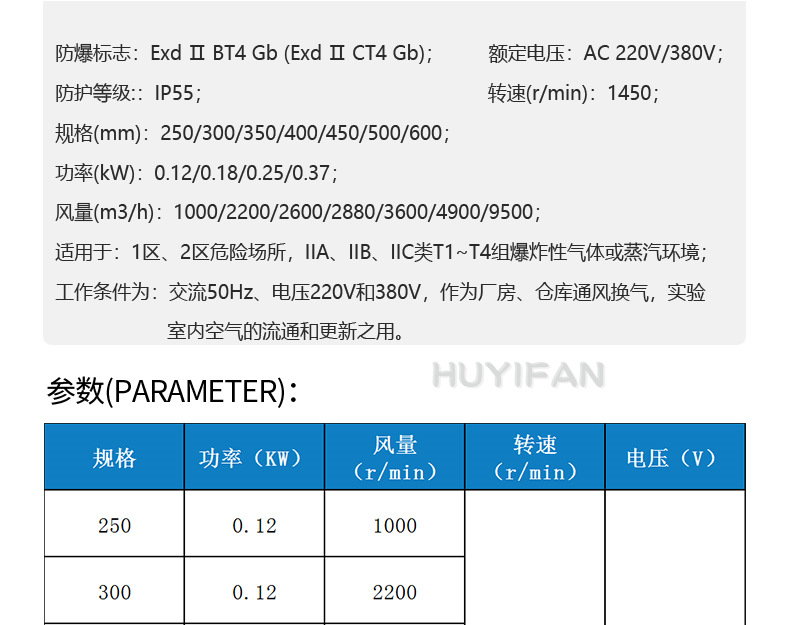 适用于:1区、2区危险场所,lIA、llB、IIC类T1~T4组爆炸性气体或蒸汽环境;工作条件为:交流50Hz、电压220V和380V,作为厂房、仓库通风换气,实验室内空气的流通和更新之用。