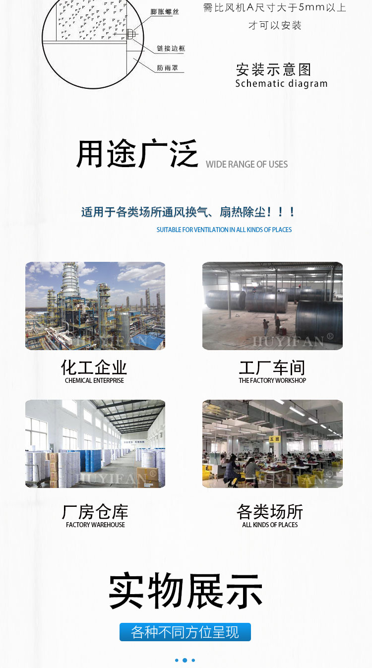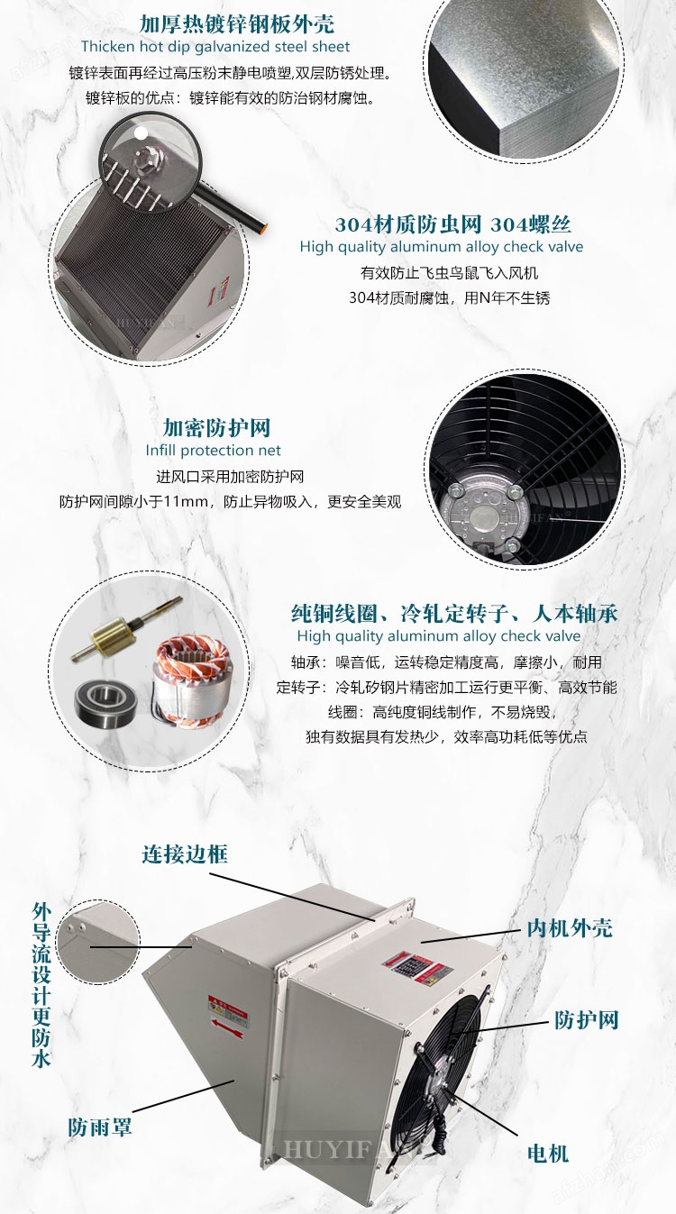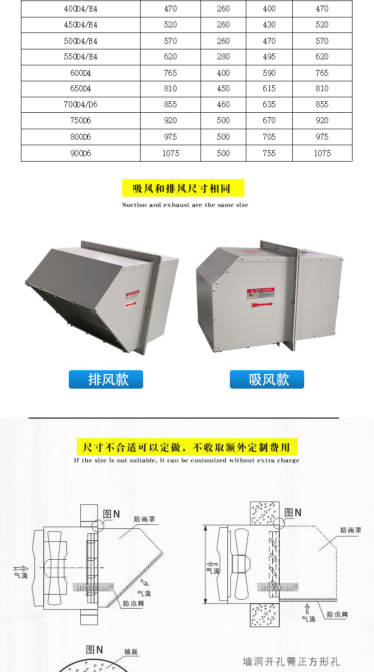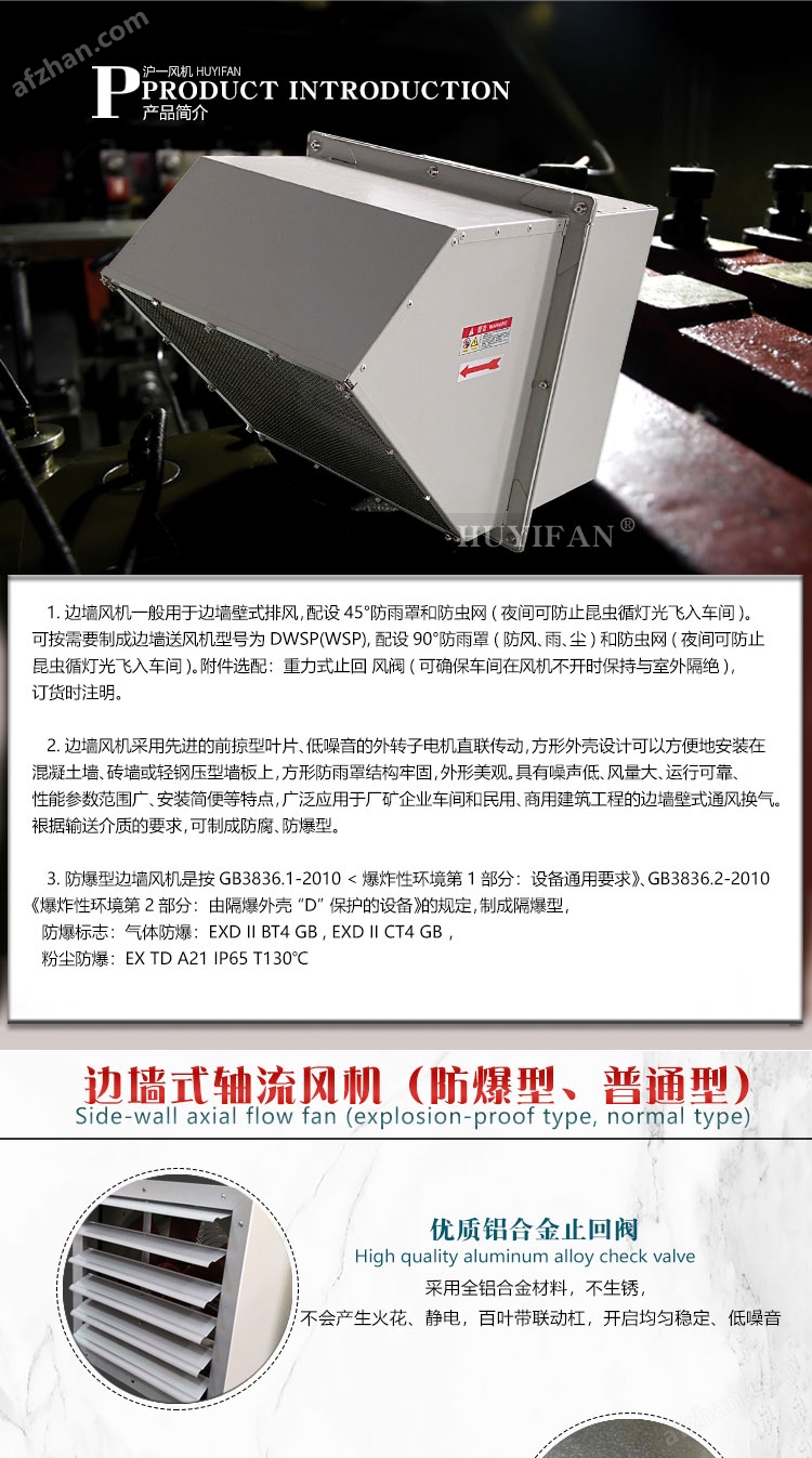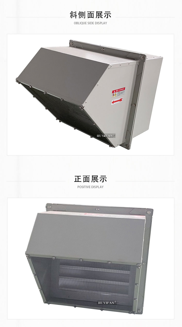 3.边墙风机采用前掠型叶片、低噪音的外转子或内转子风机电机直联传动,方形外壳设计可以方便地安装在混凝土墙、砖墙或轻钢压型墙板上,方形防雨罩结构牢固,外形美观。具有噪声低、风量大、运行可靠、性能参数范围广、安装简便等特点,广泛应用于厂矿企业车间和民用、商用建筑工程的边墙壁式通风换气。裉据输送介质的要求,可制成防腐、防爆型。