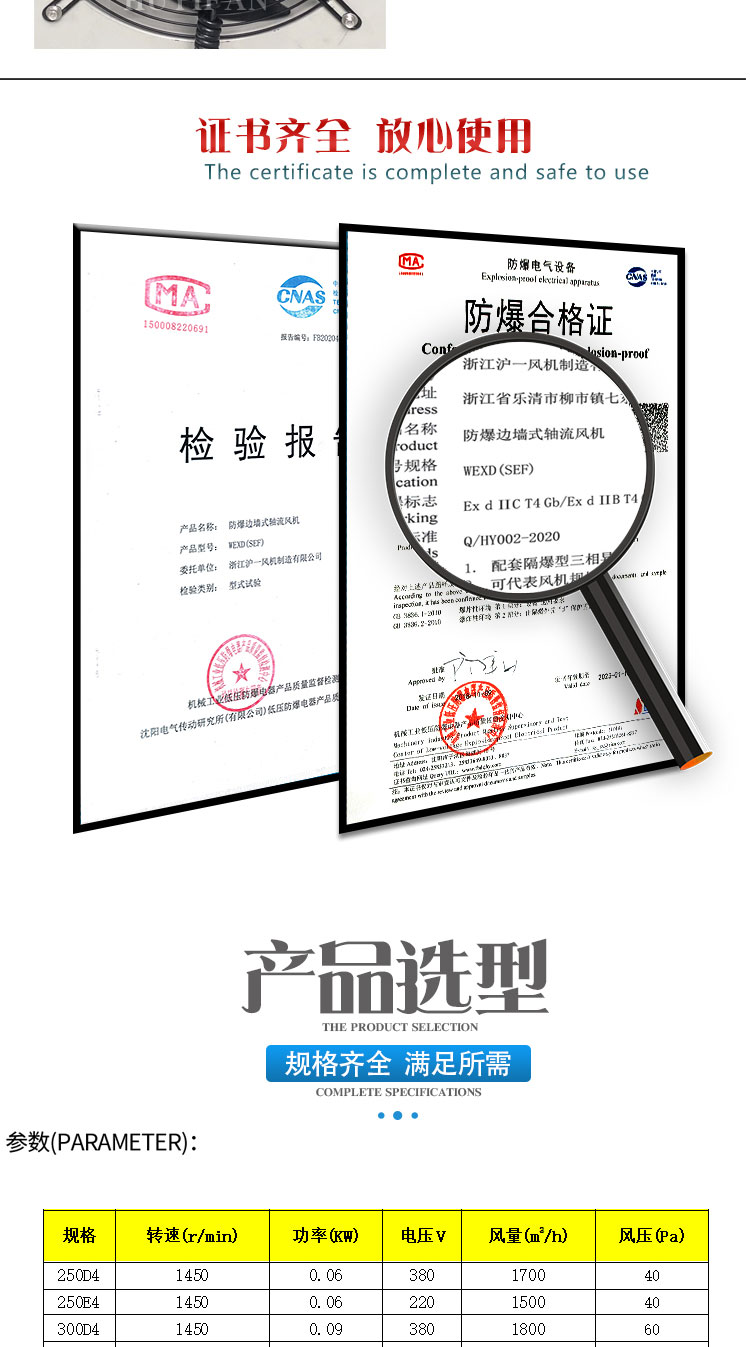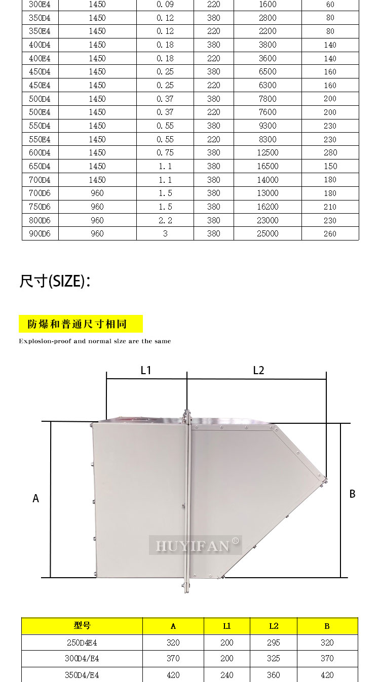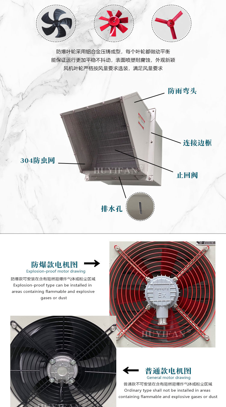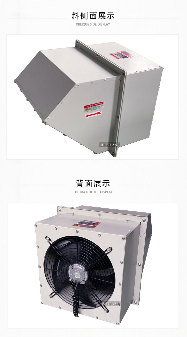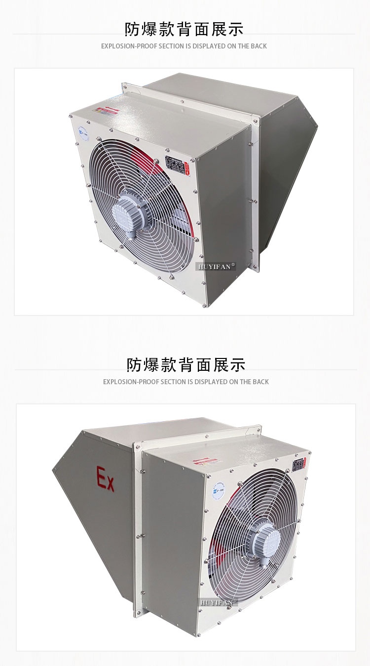 方形壁式风机220VWEXD防爆边墙轴流风机(以下简称防爆风机)是WEX的派生产品,其防爆性能符合GB3836.1-2010 ;lt;爆炸性环境第1部分:设备通用要求》、GB3836.2-2010 《爆炸性环境第2部分:由隔爆外壳“d"保护的设备》的规定,制成隔爆型,防爆标志为“Exd Ⅱ BT4 Gb"